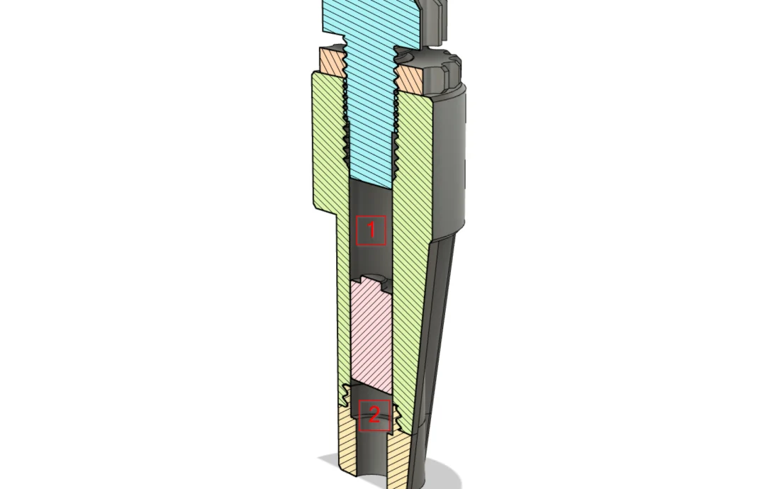 На поперечном разрезе показана внутренняя конструкция адаптера. Нож-разделитель размещается в зоне 2. Затем толкатель давит на нож сверху, который предварительно натягивается пружиной (в зоне 1) и регулировочным винтом. Для фиксации используется контргайка.