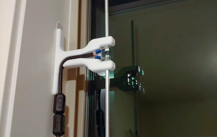 В качестве элементов антенны в этом держателе используются алюминиевые стержни с резьбой. Приобрести стержни из алюминия или латуни можно как на Озоне так и в строительных магазинах. Держатель приклеивается к оконной раме с помощью двустороннего скотча.