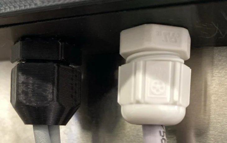 Перед вами классический кабельный гермоввод для отверстий диаметром 12 мм. Внутренний диаметр составляет 7,5 мм. Верхняя часть напечатана из TPU и поэтому может деформироваться и сжиматься винтом, который зажимает кабель. Для одновременной печати несколькими материалами вам понадобится AMS