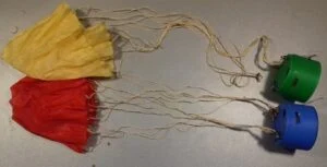 В день запусков дул относительно сильный ветер, и при взлетной высоте 750м наш «спутник» на траектории спуска с парашютом снесло на 2,5 км. Учитывая, что спутник после взлета и отделения от ракеты разделялся на 3 части