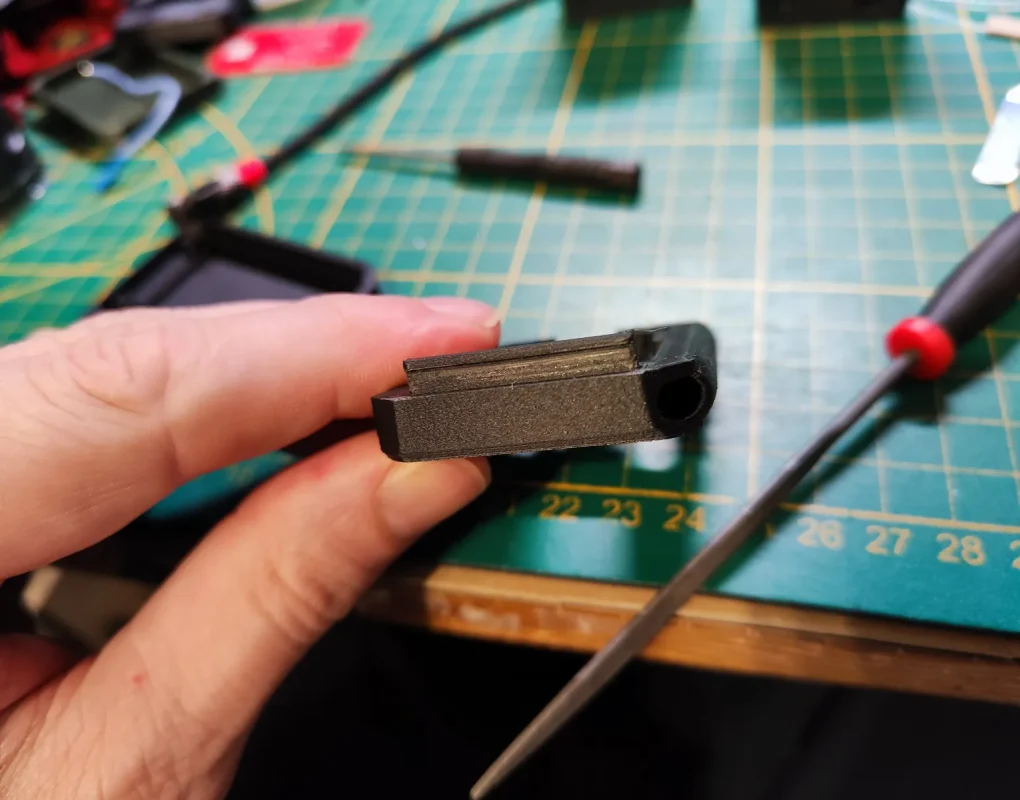 Также проверьте, насколько хорошо передняя кромка входит в заднюю оболочку, скорее всего, потребуется использовать напильник, чтобы она входила без выпячивания наружной стенки! Посмотрите на картинку ниже, кромка, которая вставляется в вырез, должна быть ровной и чистой, так как она очень плотно прилегает! Проверьте перед тем, как собирать все вместе!