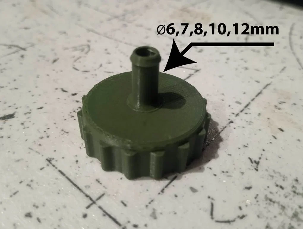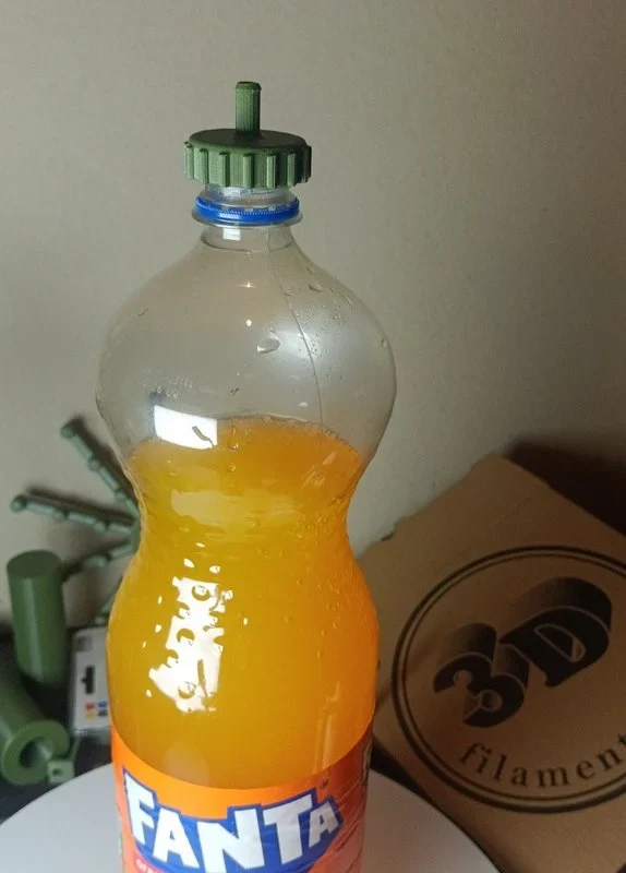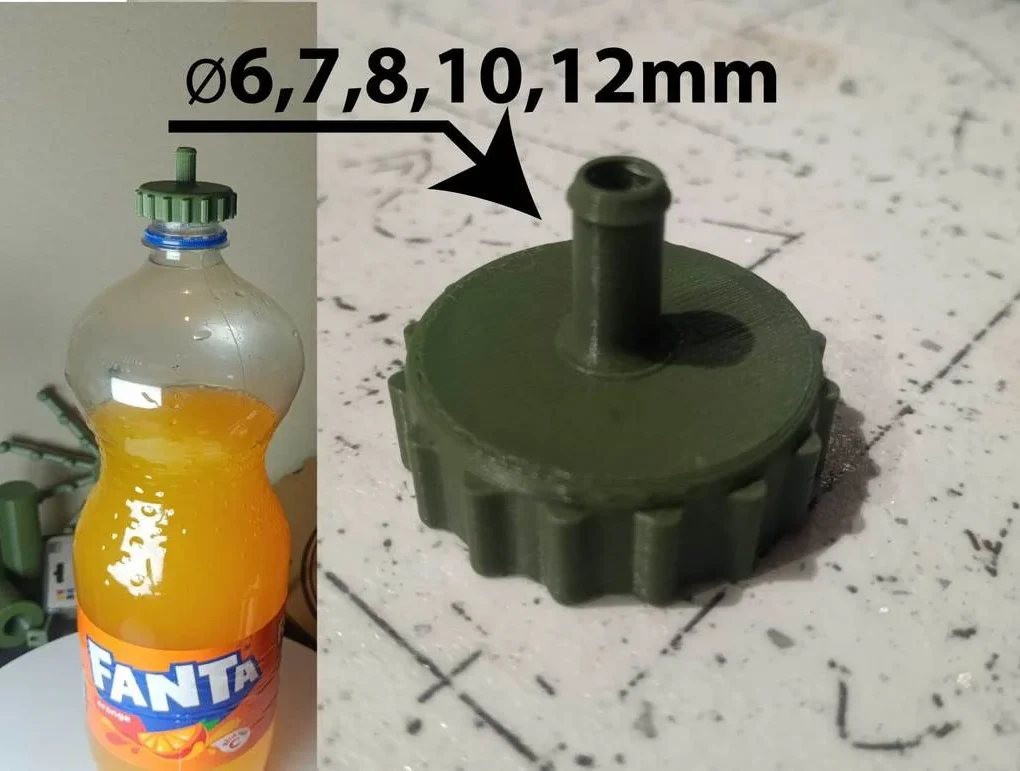 Это 3D-печатная сменная крышка для стандартной пластиковой бутылки (например, Coca-Cola или других обычных ПЭТ-бутылок), модифицированная с выходом для шланга.