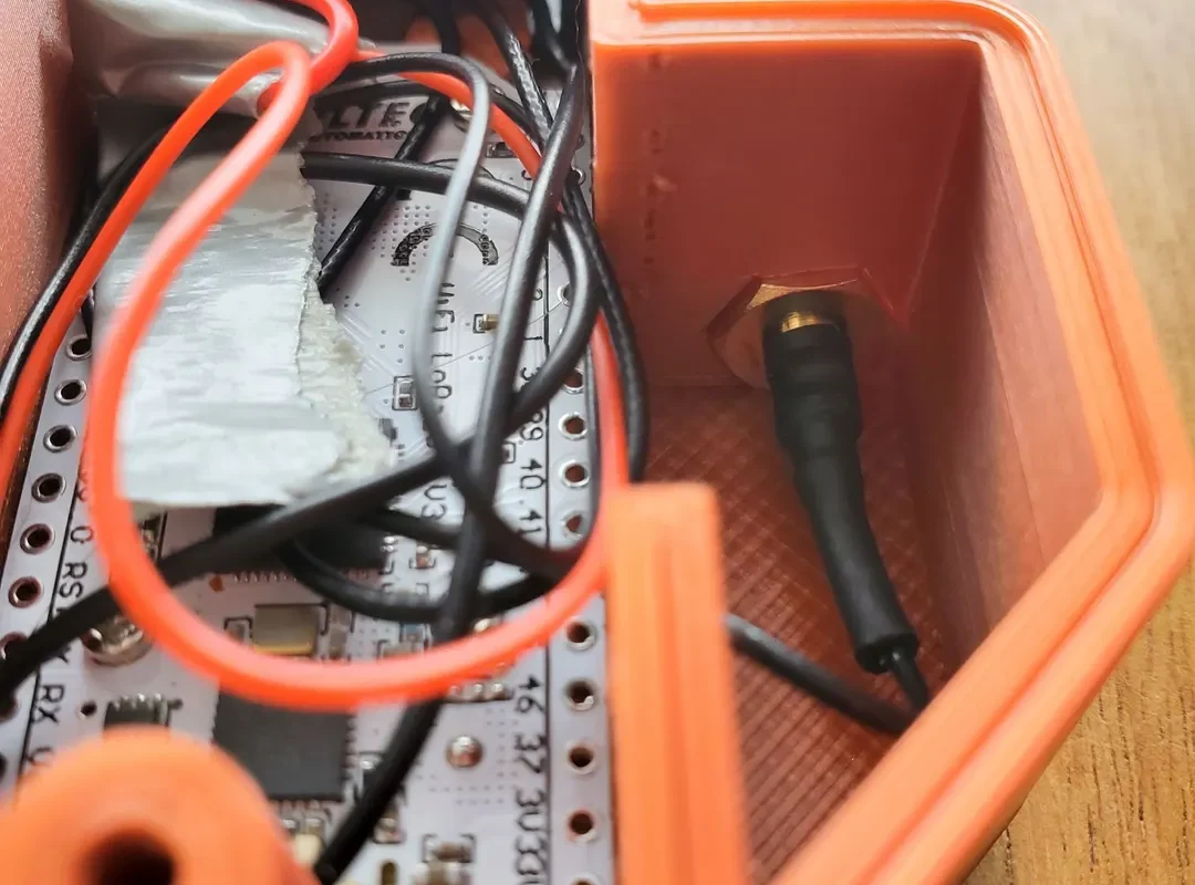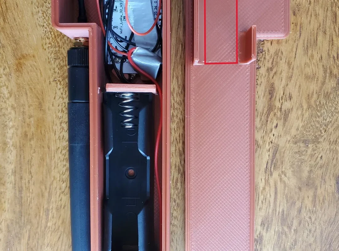 В данном случае область за heltec V3 — это место, где можно хранить спутанные провода, просто убедитесь, что при установке задней панели провода находятся внутри вертикальных опор на задней панели. Для наглядности я обозначил это место красным прямоугольником на фотографии. Вертикальные опоры на задней панели удерживают heltec на месте, поэтому не следует допускать защемления проводов между ними и heltec.