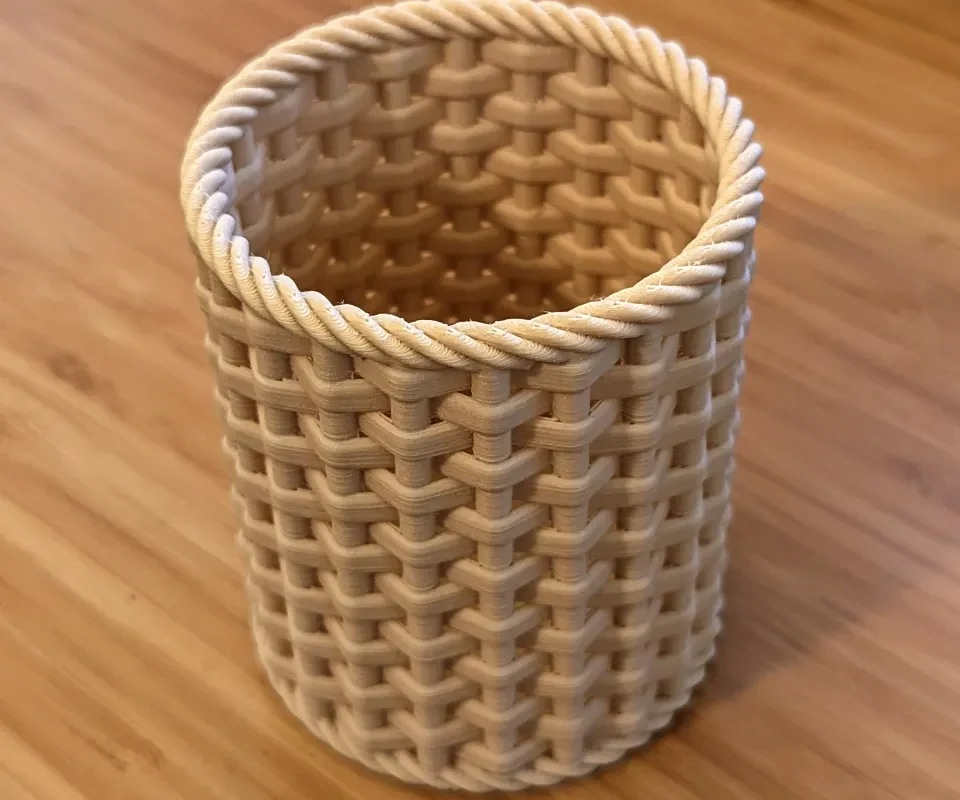 Я увидел плетеную подставку для карандашей и подумал, что было бы интересно смоделировать свою собственную полностью параметрическую версию. Фото на обложке — это отпечаток из PLA с деревянной набивкой, который, на мой взгляд, создает приятный эффект, очень похожий на настоящую плетенку.