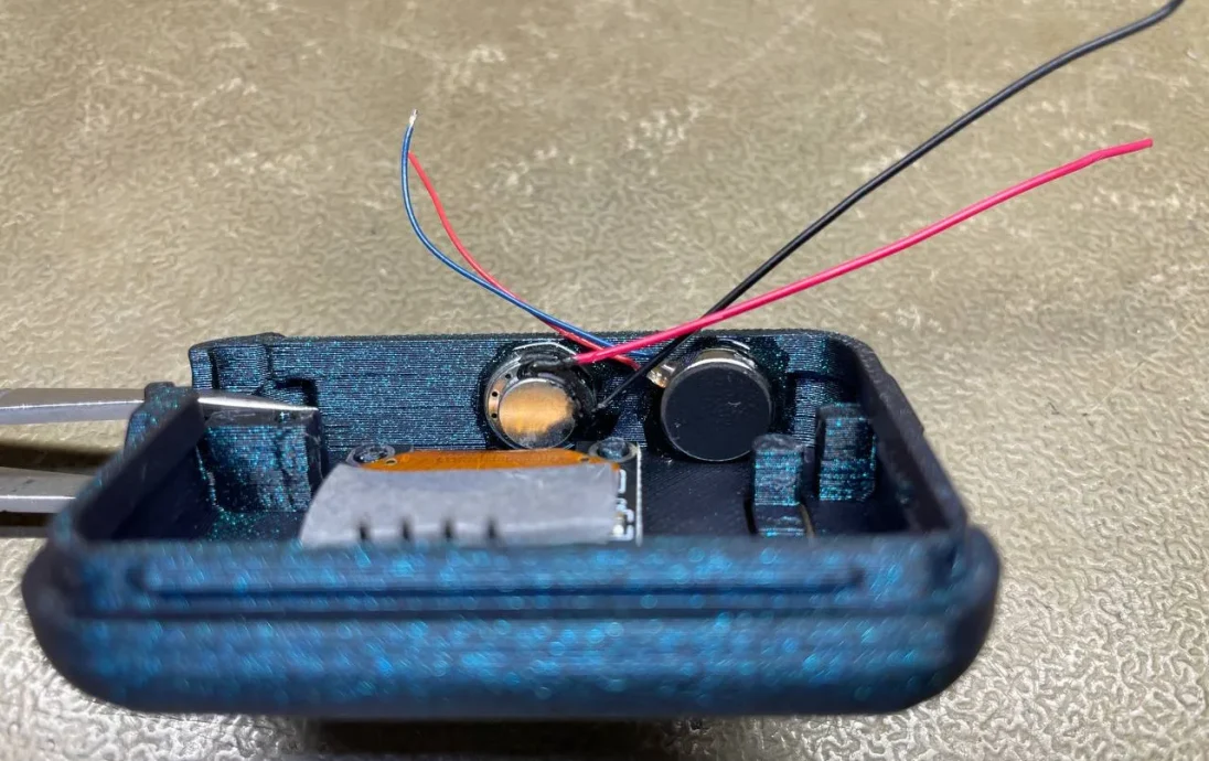 Порядок сборки: приклейте зуммер и вибро к боковой стенке (лучше использовать дополнительный клей), вставьте экран в корпус с помощью двустороннего скотча, вставьте плату и выровняйте ее, припаяйте экран, припаяйте зуммер и вибро, затем затяните винт M2×4. Батарея 2000 мАч, 103450.