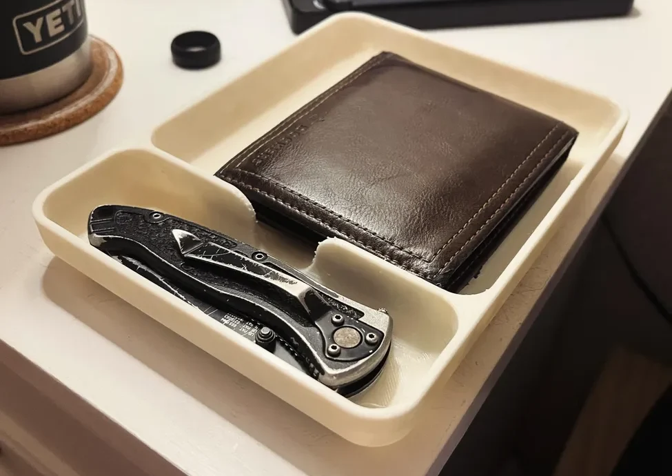 Мой нож оставлял царапины на белой тумбочке, поэтому я разработал и напечатал этот простой лоток, чтобы хранить в нем нож и кошелек. Конечно, его можно использовать и для многих других вещей.