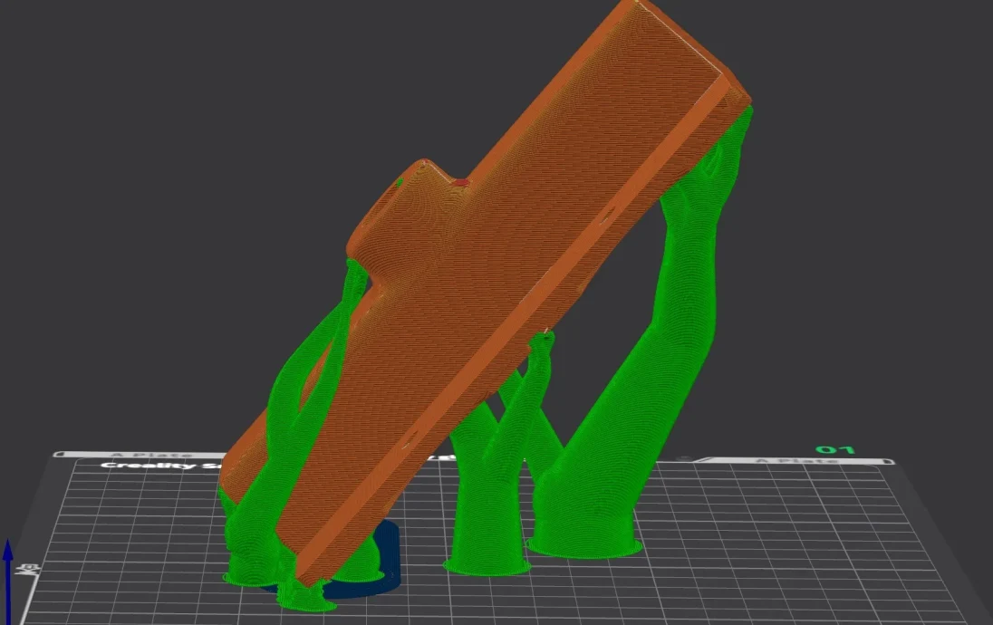 Я напечатал из ABS, с 25% заполнением под углом 45 градусов с деревянными опорами.