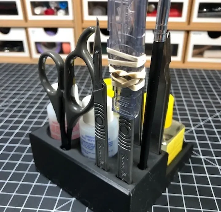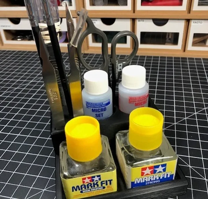 Органайзер для хранения двух флаконов Micro Sol и Micro Set. Также вмещает два квадратных флакона типа Tamiya. Вмещает два пинцета Tamiya, две рукоятки скальпеля, две кисти и ножницы для декалей Tamiya или аналогичные.