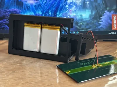 Передняя часть рассчитана на солнечную панель размером 110 x 60 мм и толщиной 2,5 мм. Панель располагается почти вровень с передней панелью и подключается к Heltec. За солнечной панелью есть место для двух литий-полимерных батарей 803450, соединенных параллельно. При желании можно использовать и одну батарею 803450. Доступное пространство для батареи внутри корпуса составляет 69 x 52 x 8 мм. Если вы используете только одну батарею, ее можно просто закрепить каптонной лентой, как показано на фотографиях.