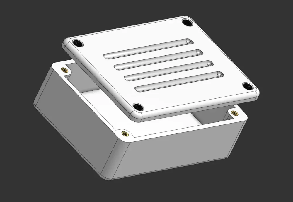 Прочный корпус для печати, скрепленный винтами M3x7 и термозакрепляемыми вставками M3x4 или M3x5. В стенках можно прорезать отверстия, просверлить отверстия или проплавить отверстия для прокладки проводов и других компонентов.