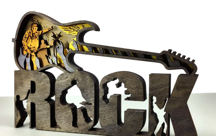 🎸 Брутальная надпись «РОК» в сочетании с рельефной гитарой — многослойная композиция для настоящих меломанов. Слои дают глубину и тени, подсветка сделает образ ещё эффектнее. Отлично смотрится в музыкальной комнате, баре или студии.