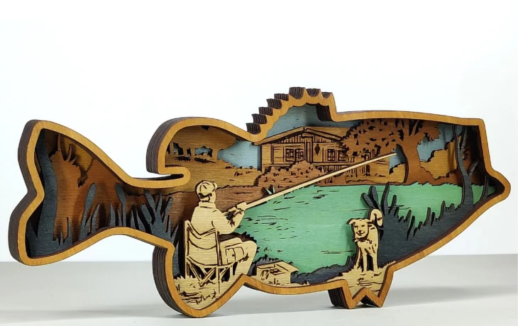 🎣 Тихий пейзаж: рыбак в лодке, покачивающаяся вода, дальние берега и небо — всё это выполнено в нескольких слоях, которые создают глубину и атмосферу спокойствия. Отлично смотрится как настенное панно или лайтбокс с подсветкой между слоями.