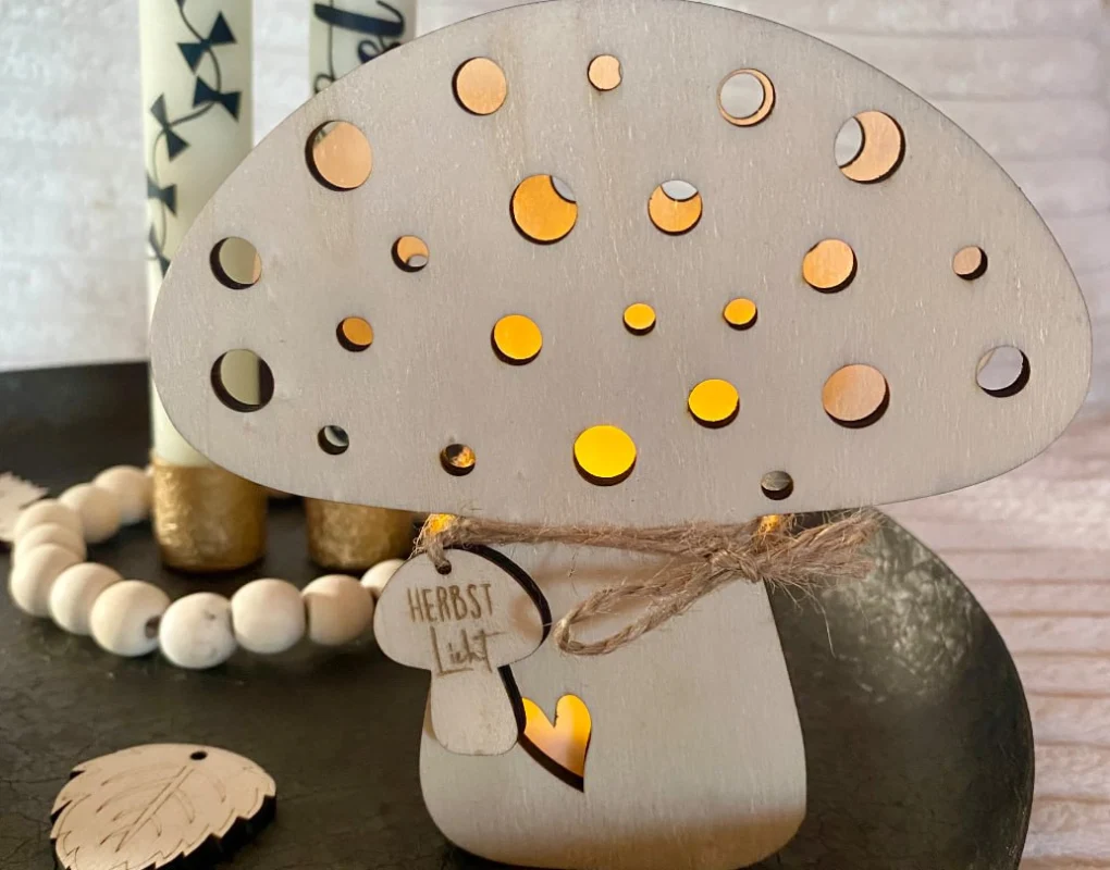 🌲 Волшебный светильник в форме мухомора создаст уют и сказочную атмосферу. После лазерной резки просто склейте боковые части и дно, а внутрь поместите светодиодную лампу для чайника или небольшой светящийся шарик.